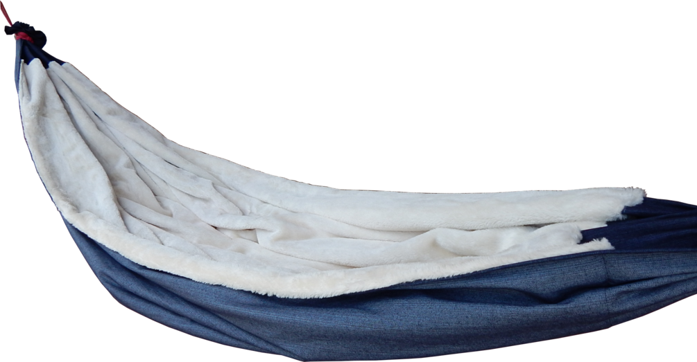 Measuring 9' long and 5' wide, the bean bag hammock features stretchy jeans canvas on the bottom and polar bear fur on the top. Inside is 15 gallons (57lts) of round polystyrene "beans" that completely conform to the shape of your body. The ends are tied with 2knot's original interlaced clove hitch loop that is guaranteed not to slip. This hammock holds a maximum of 300lbs (137kg).